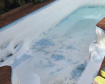 Usually, after 10-15 years, age and direct exposure of sun rays result in a colour distorted fibreglass pool. The top coat colour starts fading, leaving behind a white and sometimes flaky pool surface. In extreme cases where the top gel coat is of bad quality, colour distortion may result in gel coat deterioration with the top coat granulating and become chalky which is harmful to humans if inhaled or drank.
